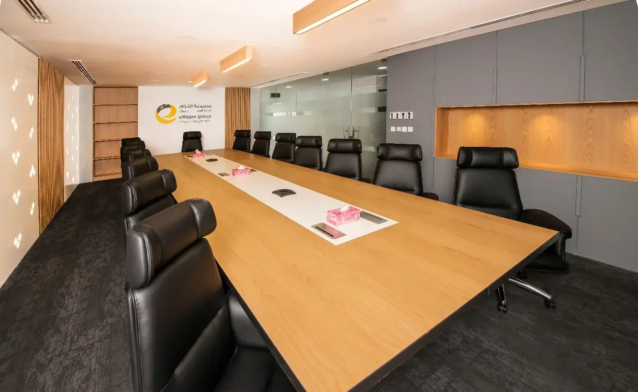 Eltizam Board Room – Executive Meeting Space by Monolith The Eltizam Board Room, designed by Monolith, is a sophisticated and functional space tailored for high-level executive meetings. The interior features a custom-built boardroom table, premium black leather seating, and sleek wooden paneling, creating an atmosphere of professionalism and elegance.